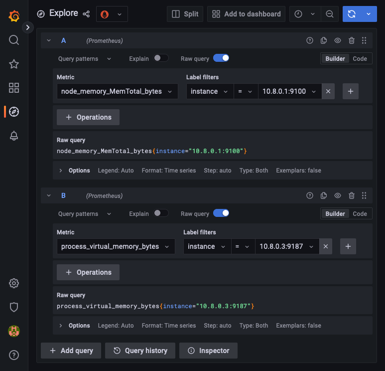 6. You can now start building dashboards in Grafana using the metrics collected in Prometheus. Open the Grafana web interface as shown in the guide linked above, and use the Explore menu to create queries.